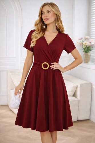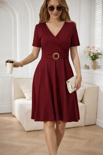 • Kadın kısa kollu kruvaze yakalı önden toka detaylı kısa viskon elbise